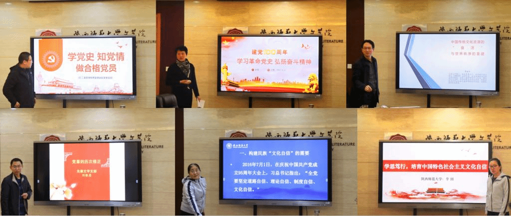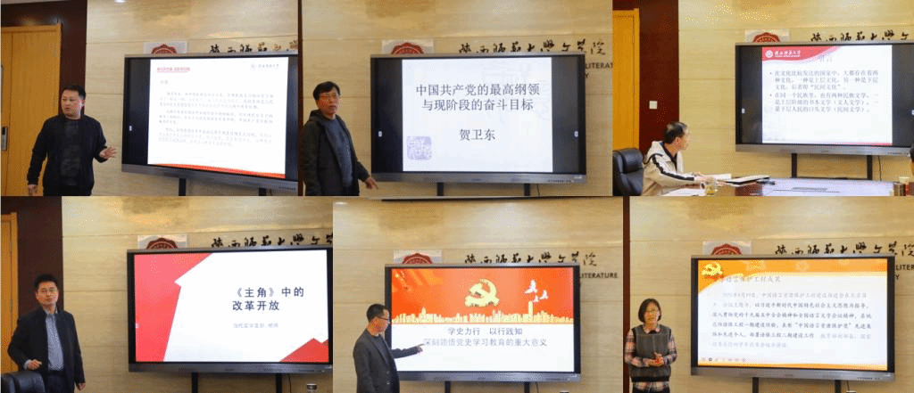 参与比赛的12位教工党支部书记依次登台。行政党支部书记张荣华联系历史事实,就如何正确认识改革开放前后两个历史时期展开了讲述;课程教学论与古典文献学党支部书记贺卫东结合具体事例,以“党的最高纲领和最终目标”为主题,开展叙述;现代文学党支部书记钟海波就民间文化和民间文学展开了阐述;当代文学党支部书记杨辉以小说《主角》为载体,讲述了其中所展现的改革开放的缩影;现代汉语党支部书记刘艳以“知史懂史”为主题,分享了语言保护工程重要成果;古代汉语党支部书记王伟以“学史力行、以行践知”为主题,展现了党史学习教育的重大意义;文艺学、比较文学与世界文学党支部书记赵文以“学党史、知党情、做合格党员”为主题,结合理论基础和党史党情,对合格党员应有素养进行了阐述;民俗与民间文学党支部书记李永平围绕“中国传统文化资源的‘盘活’与世界秩序的重建”,就文化的新旧碰撞展开讲述;秘书与写作党支部书记赵颖以“学习革命党史,弘扬奋斗精神”为主题,以王尔琢的“革命不成不回家”事例为例,深刻展现了优秀党员的带来的启示意义;先秦党支部刘银昌讲述了“党章的历次修正”;元明清文学党支部书记何悦依照“习近平总书记关于文艺创作的阐述”,提倡创作要满足人民需要,构建民族文化自信;学工党支部书记辛田以“培育中国特色社会主义文化自信”为题,从文化特点、认识历程、基本经验三个方面,阐述继承和弘扬中华优秀传统文化,培育文化自信。