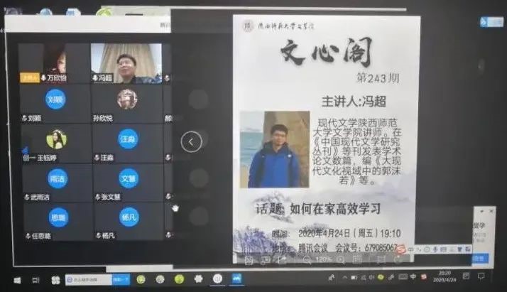 4月24日晚19:00,本学期第2期(总第243期)文心阁活动在腾讯会议平台顺利开展,bw西汉姆联冯超老师应邀参加。冯超老师现为bw西汉姆联现代文学讲师,在《中国现代文学研究丛刊》等刊发表多篇学术论文,编有《大现代文化视域中的郭沫若》等书籍。此次文心阁活动中,冯超老师就“如何在家里高效学习”的话题与同学们进行讨论交流,切实解决了同学们当下的学习困惑。