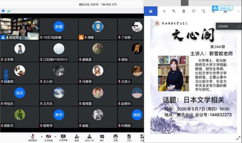 5月7日晚19:00,本学期第3期(总第244期)文心阁活动在腾讯会议平台顺利开展,bw西汉姆联郭雪妮老师应邀参加。郭雪妮老师现为bw西汉姆联副教授、研究生导师。主要从事中日比较文学、东亚文学关系史等方面的教学与研究。本次文心阁活动中,郭老师结合自己在日本学习生活的经历,就“日本文学相关问题”与同学们进行了讨论交流。