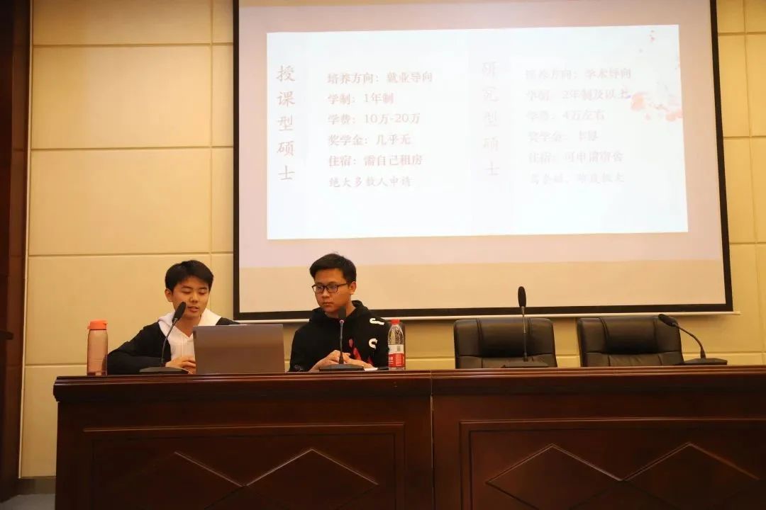 王沛杰重点向同学们介绍香港授课型硕士的基本情况、主要的申港公司以及相关专业。赵旭聪着重分享留学项目申请的经验,围绕留学前期准备、申请流程、申请专业三个方面做介绍,其中前期准备涉及必修课成绩、实习经历、英语口语等方面。他认为,必修课的成绩与绩点是前期准备的重中之重,实习经历是锦上添花,同学们应注意各方面的平衡。