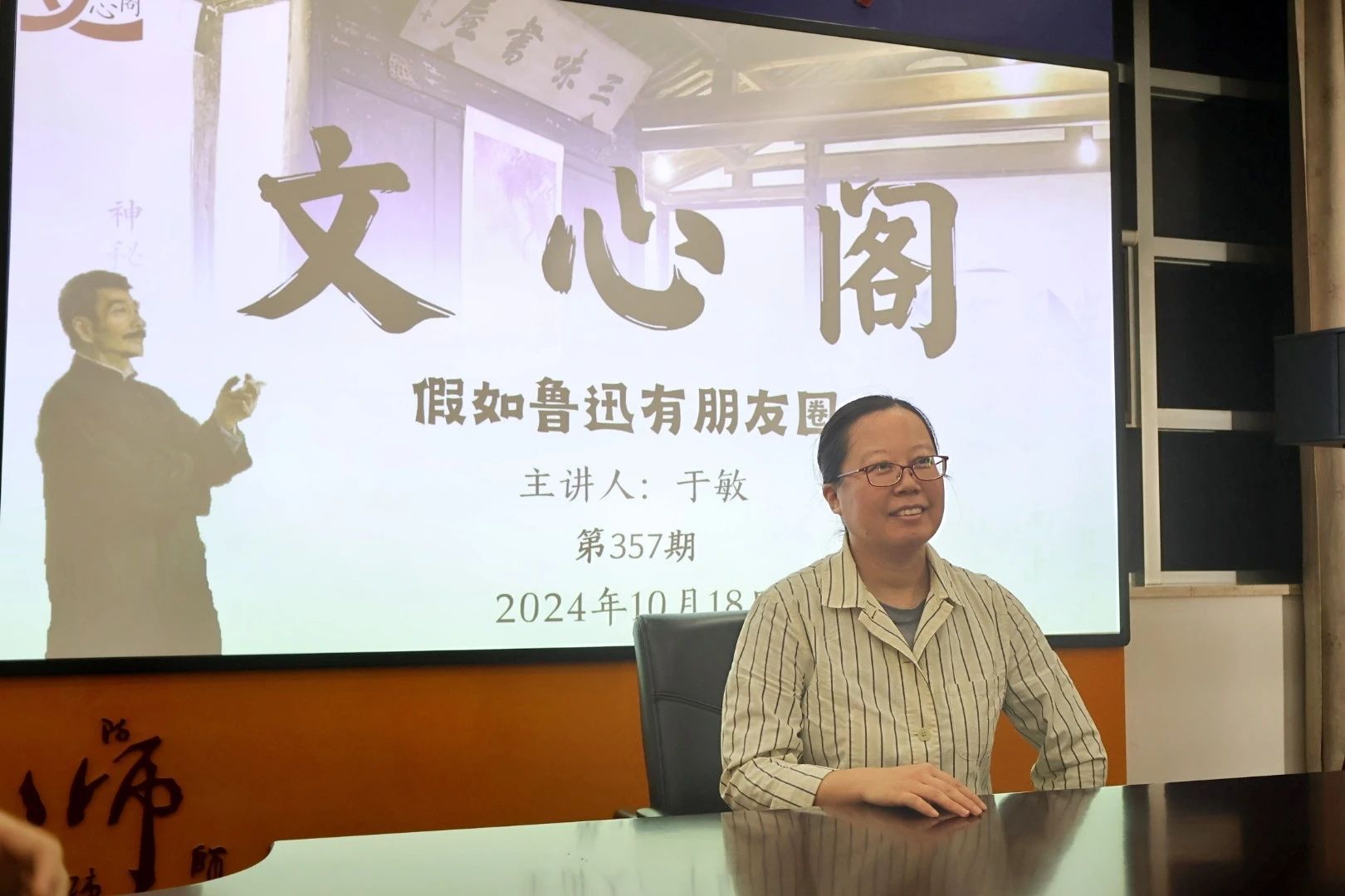 10月18日,本学期第4期(总第357期)文心阁活动在长安校区图书馆会议室成功举办。bw西汉姆联副教授、中国现当代文学教研室的于敏老师,以“假如鲁迅有朋友圈”为主题,与同学们展开分享交流。