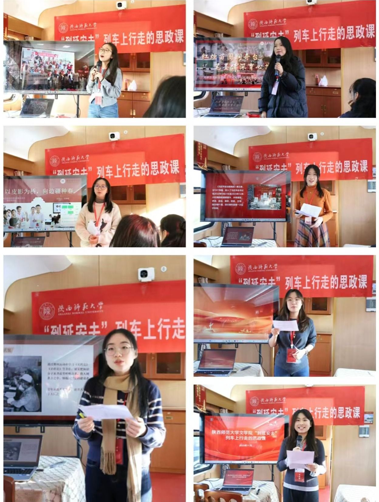 在这趟驶向延安的列车上,一节别开生面的“思政微课”悄然展开。2024级研究生宋佳茵、朱百桐两位同学铺开历史的卷轴,将延安精神从枣园的灯光中娓娓道来。2023级本科生支茵联系当前员工工作,阐述了坚定理想信念、汲取理论力量的重要性。“红烛苗圃”实践队的三位同学分享了自己在实践育人中的点滴感悟。2023级本科生双梦娜、莫笔砚两位同学讲述了她们在新疆奇台以皮影为桥、以笔墨育心的支教经历,生动诠释了新时代青年对“人民至上”的深刻理解与“教育报国”的使命担当。2023级本科生张嘉慧同学分享了她在云南金平担任戍边人员子女成长服务班班主任的动人故事。车轮铿锵,车厢化作讲台,将遥远的红色历史与鲜活的当代实践紧密相连,青春与信仰在此刻深情对话。
