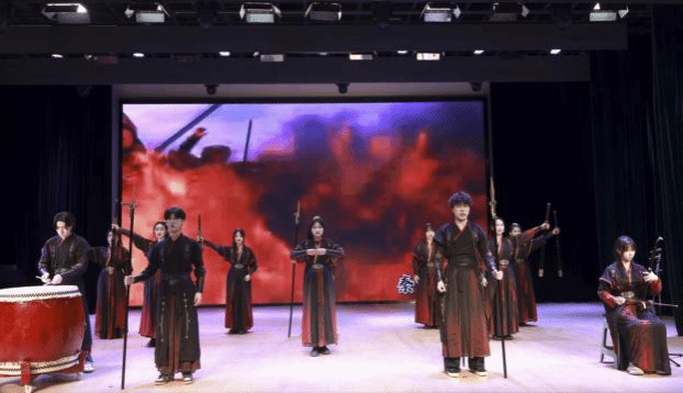 比赛中,参演同学精神饱满,配合默契,奉献了一场精彩的吟诵表演。演出由激昂鼓点拉开序幕,引领观众步入两千年前的秦军阵营。在铿锵有力的独吟与合吟声中,传递深厚的战友情谊与昂扬斗志。最后,以深情咏叹,表达生死相依的坚定与“与子偕行”的誓言,将家国情怀与袍泽之谊娓娓道来。整场演出淋漓尽致地展现了集体主义精神与保家卫国的豪情,赢得评委与观众的高度认可。