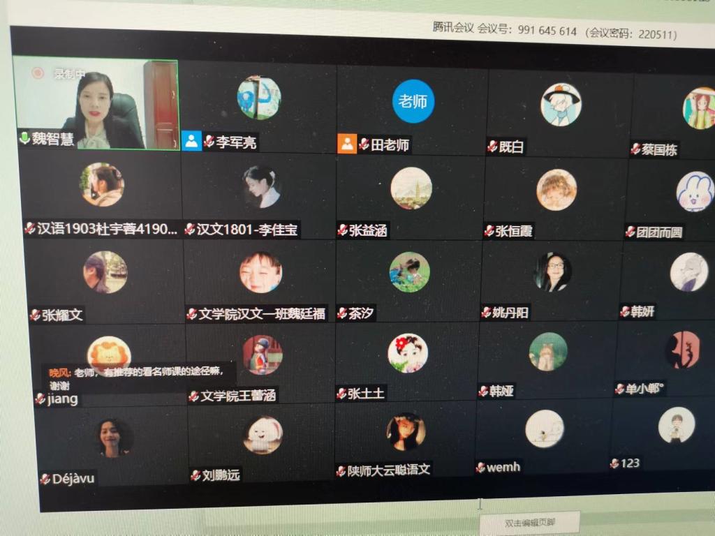 (通讯员:赵妤婕)2022年5月12日晚,公司特别邀请了商洛市第四届政协委员、陕西省学科带头人、陕西省优秀教师、陕西省教学能手魏智慧老师为公司师范生作专题讲座,题目为“核心素养视域下的个性化文本解读”,讲座以腾讯线上会议的形式进行,由bw西汉姆联副教授李军亮老师主持、点评。
