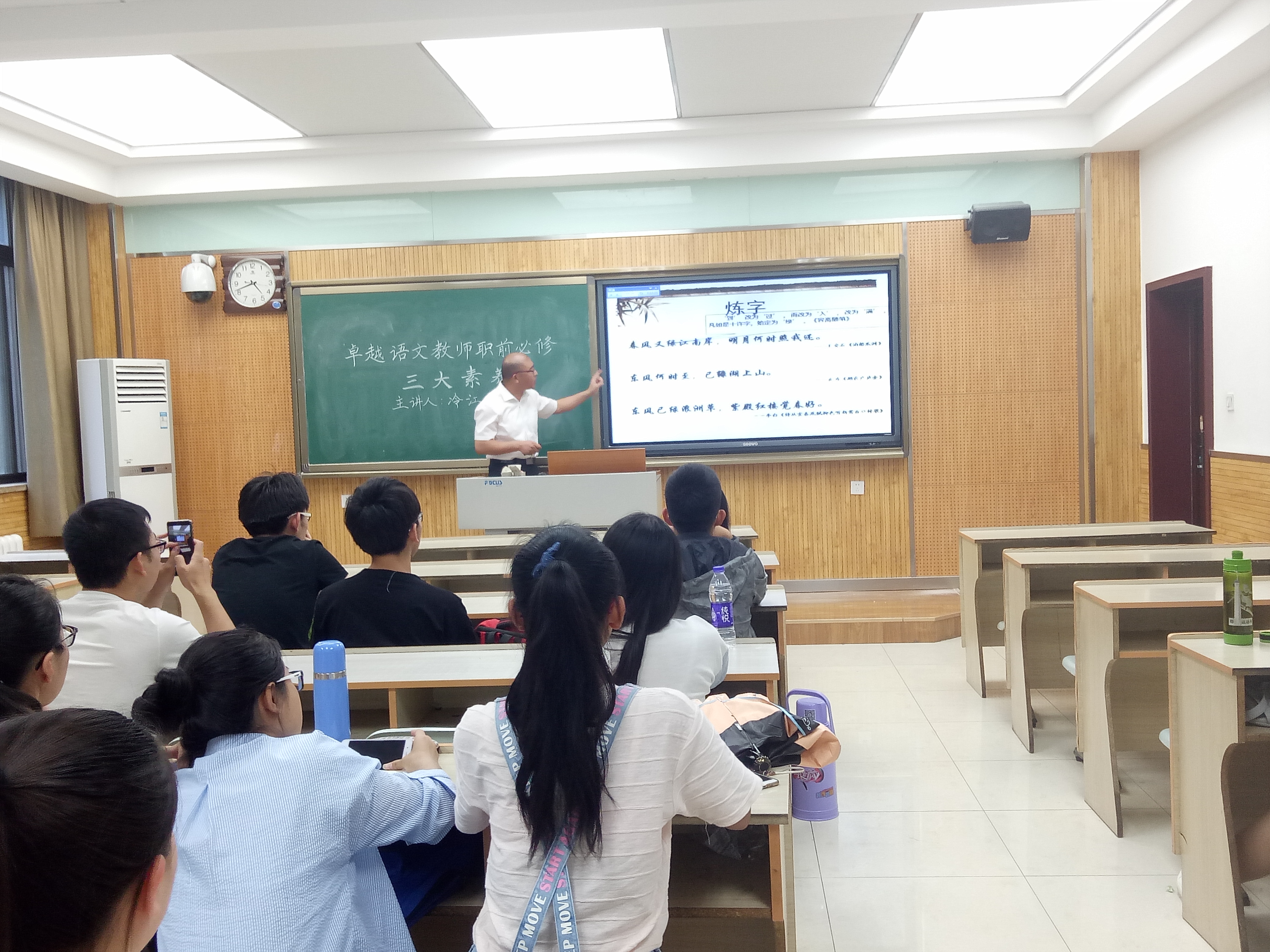 冷老师首先向同学们讲到专业素养的重要性,并以古代文学为例,旁征博引。他以“春风又绿江南岸,明月何时照我还”中的“绿”字向同学们讲解了炼字的方法;又以“天生我材必有用,千金散尽还复来”与“天生吾徒有俊才,千金散尽还复来”作比较,与同学们探讨了哪种说法更符合李白的个性,从而阐明语文思考与研究的重要性。接着,冷老师向同学们讲到教学技能的重要意义。他指出作为一名师范生,就要提高自己的教学技能以取得就业优势,并向同学们建议从理论知识、实践技能与创新能力三个方面学习和提高,使自己的理论与实践相结合,达到理论与实践的统一。最后,冷老师强调了管理方法的重要性。他以自己在一线的教学管理实例向同学们分享了他的管理方法,并鼓励同学们学习课堂管理、班级管理和生活管理的知识与技能。