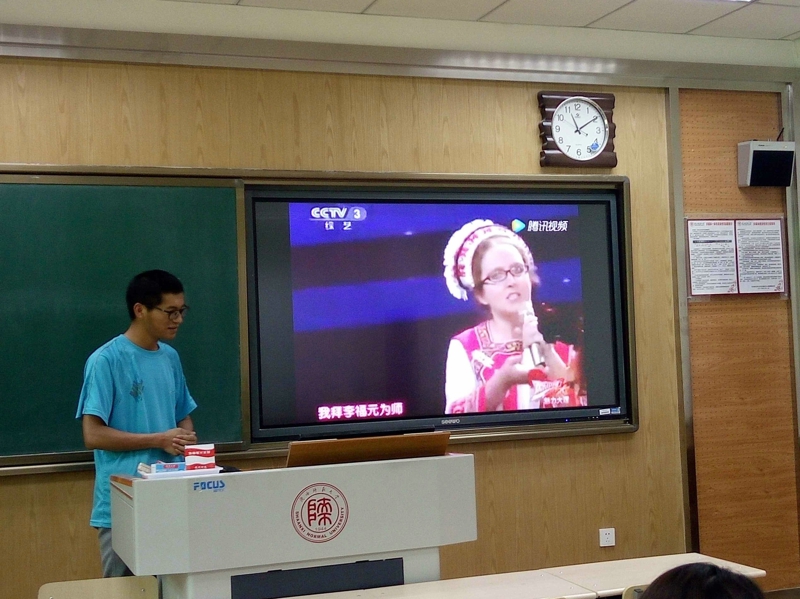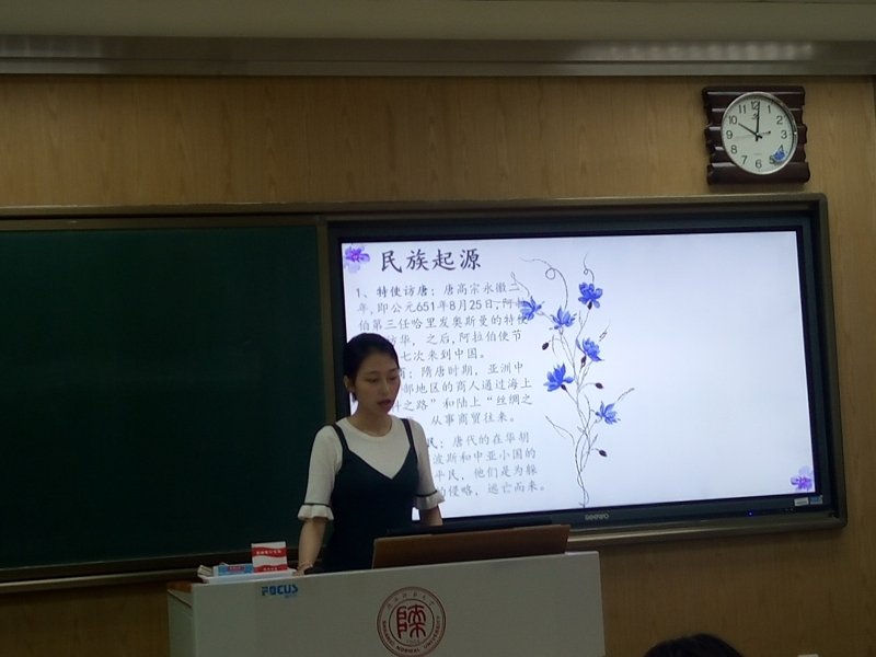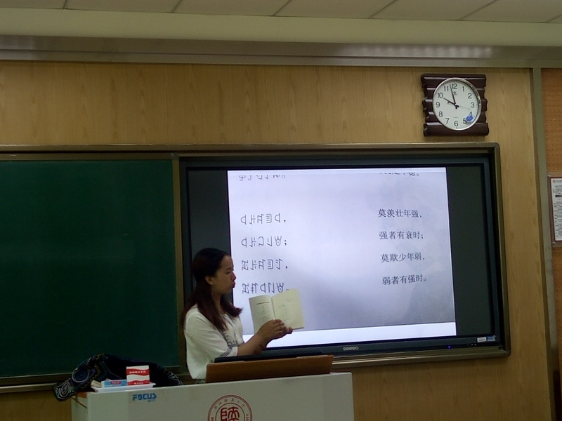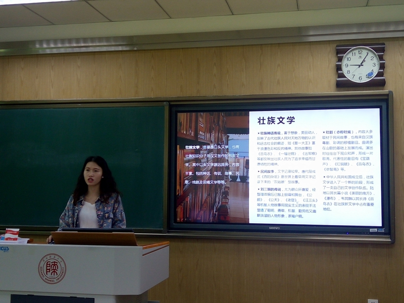 经过精心准备,活动在同学们热情参与中开始了。首先,汉语言文学2班的杨家宾同学为大家普及了有关白族和大理的文学作品与文化遗产,让大家不仅看到了苍山洱海的自然风光,还领略到了她在历史进程中沉淀下来的人文财富;随后,汉语言创新班的王斌同学将大家带进了四川的凉山彝寨,大家欣赏了火把节的盛况,也学习了彝族繁复的文字与优美的民谣;接着,汉语言文学2班和3班的李俏与梁晓莲同学更是跨班合作,为大家展示了能歌善舞的壮族的古老神话,让大家感受到了追逐太阳的民族的那份执着……
