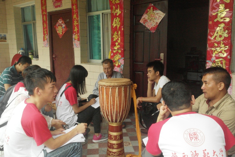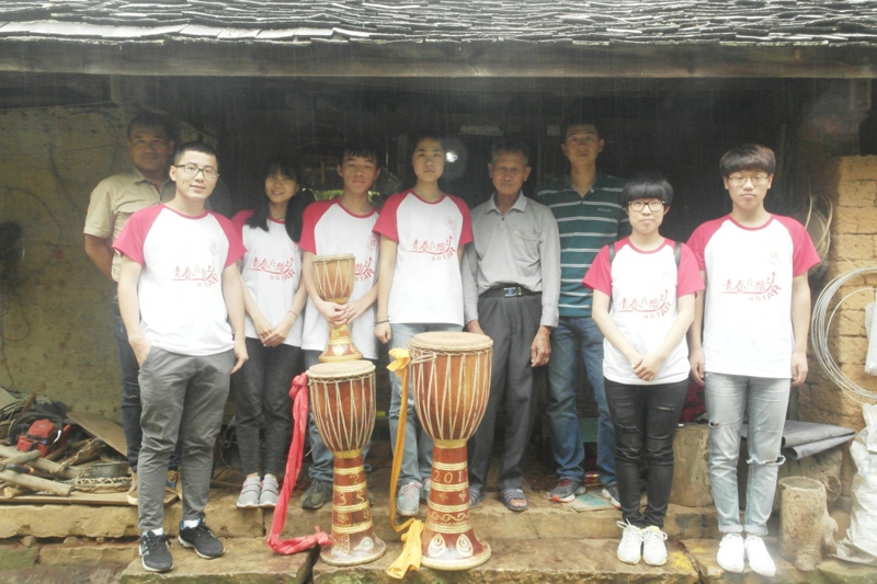 为详细了解景谷县民间传统手工艺的传承与发展,7月14日早9点,实践团成员拜访了景谷县象脚鼓手艺传承人谢红星师傅,象脚鼓是因鼓身似象脚而得名,深受傣族人民的喜爱,是其民族歌舞中不可缺少的乐器,景谷象脚鼓队曾代表云南参加中华鼓舞大赛,并荣获最高奖“山花奖”。谢师傅向成员们展示了大小材质各异的象脚鼓,并为大家献上了一小段精彩的象脚鼓舞。随后,实践团成员对谢师傅进行了深入的访谈,了解到他的经济情况、收入来源以及象脚鼓制作手艺的传承情况和市场需求。
