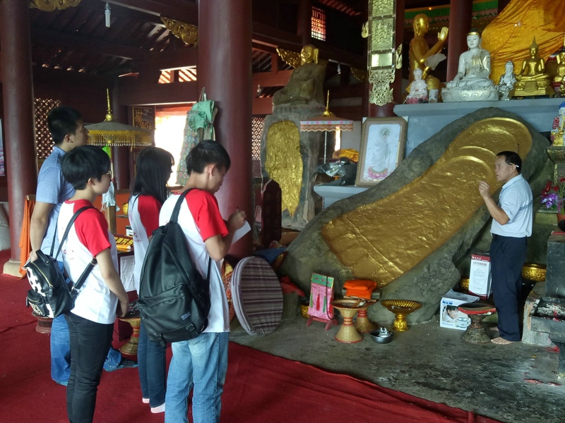 之后,成员们来到了雷光佛迹寺,雷光佛迹寺坐落在永平镇芒腊村芒景社北部2公里的莱贯罕山上,前面有雪白如练的大叠水岩瀑布,后有郁郁葱葱的参天古树。相传释迦牟尼曾到此传教,在石板上留下第四个巨型脚印,遂成为上座部佛教朝觐圣地。佛寺管理小组组长刀永平先生向成员们介绍了傣文经书中记载的四个巨型脚印的来历,并向大家讲述了佛教文化精神。他指出,社会和谐的根本是人人心存善念,而佛教文化正是一种净化心灵,引人向善的精神文化。他希望大家能以一颗虔诚的心去学习佛教文化,做一个慈悲善良的人。