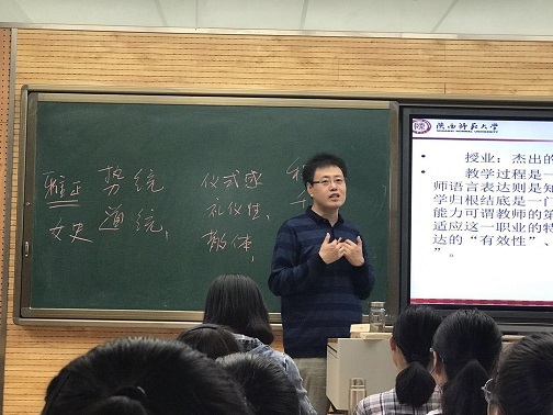 在最后的“卓越讲坛”第一讲部分,魏景波教授给同学们做了题为“追求卓越,砥砺前行——优秀教师必备的能力与情怀”的重要报告。魏老师首先说明了开办“卓越讲坛”的设想与初衷,计划陆续延请学术名家与教学名师登上讲坛,传经送宝,开阔同学们的视野。接着,魏老师从唐代韩愈的师者定位“传道、授业、解惑”出发,赋予这三个关键词以教师职业的现代涵义,将当代教师的核心能力定位为敏锐的文化判断能力、杰出的语言表达能力以及良好的人际沟通能力,用自己的教学实践和鲜活案例,对此进行了生动的阐释。最后,魏老师强调:“优秀教师应有的情怀是分享与幸福。教师不仅是太阳底下最光辉的职业,更是太阳底下最幸福的职业。”并以陕师大“抱道不屈,拥书自雄”的学风勉励同学们,希望同学们能够“登高望远,踌躇满志,追求卓越,砥砺前行”,成长为具有远大抱负和过硬素质的优秀教师。