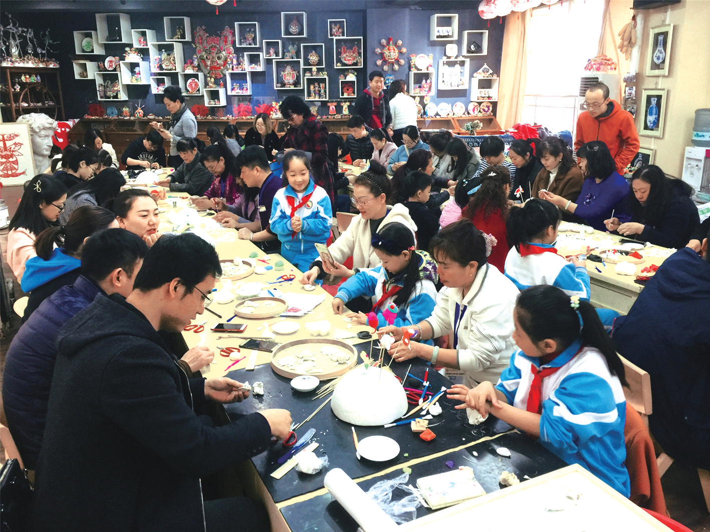 第八期(面花)培训班学员在西安市高新区第二小学与孩子们交流互动。
