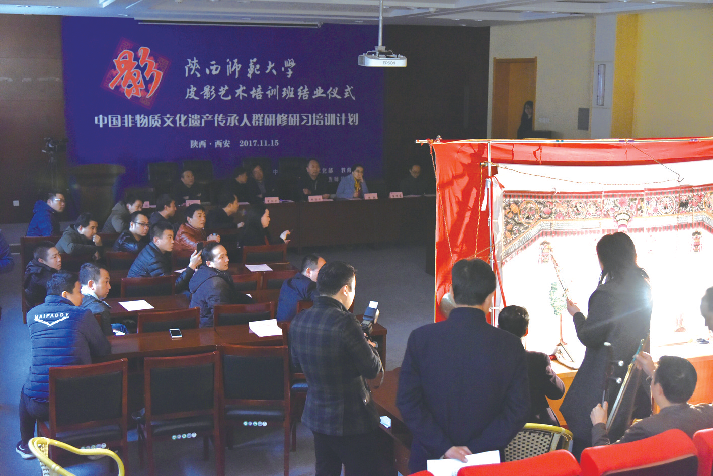 第七期(皮影)培训班结业仪式上,学员们正在表演皮影戏