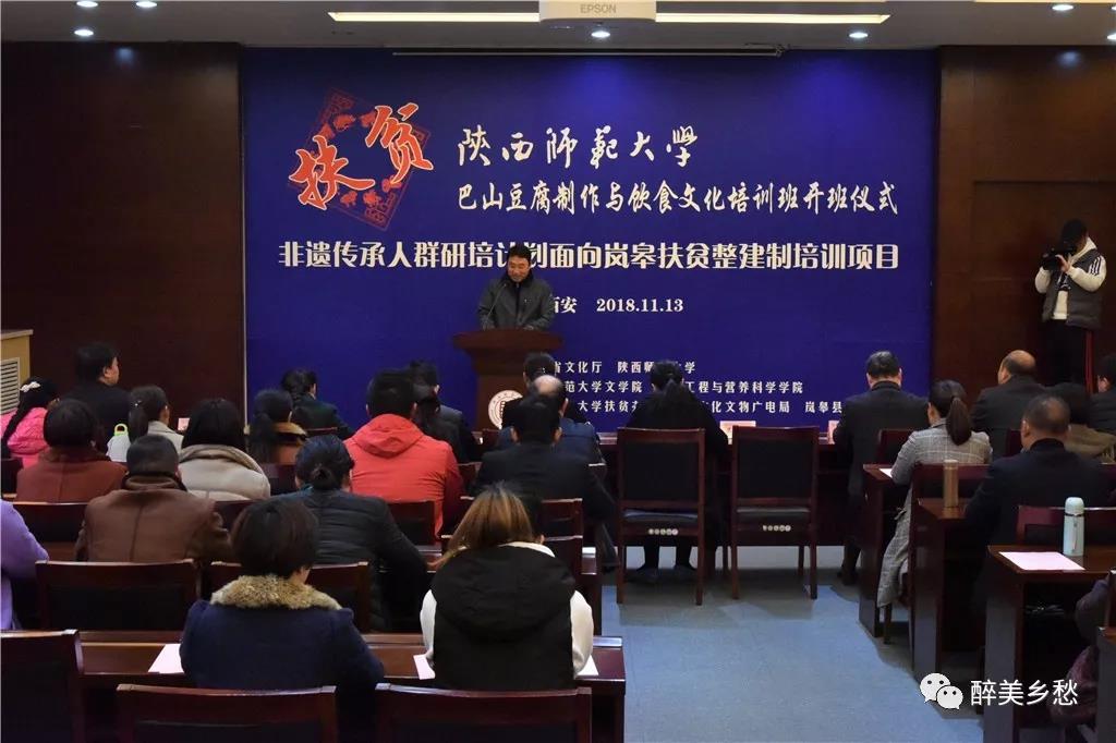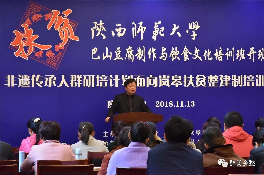 开班仪式于11月13日上午在bw西汉姆联长安校区文汇楼111报告厅举行。陕西省文化和旅游厅非物质文化遗产处副调研员周颖、岚皋县文广旅游局副局长许祖琴、bw西汉姆联扶贫办主任(科技处处长)吴晓军、食品工程与营养科学公司经理杨兴斌、陕西文化资源开发协同创新中心常务副主任李西建、文公司党委书记孙清潮、驻岚皋县四季镇天坪村第一书记杜炳志,以及食品工程与营养科学公司副教授、本期研培课程负责人邓红老师等出席了开班仪式。
