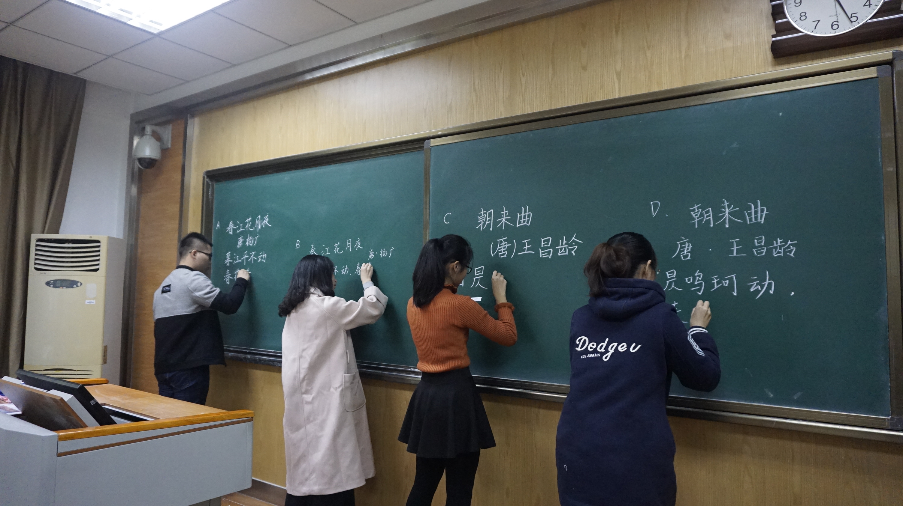 比赛现场同学们凝神聚力,一笔一划,认真对待,在比赛有限的时间和紧张的气氛之下,创造出雄秀端庄、形神兼备的书法作品,展现了参赛同学纯属的书法技巧和扎实的书法功底。在评分环节,老师们在笔画形态、字形结构、作品卷面等方面对书法作品做了点评与指导。王怀中老师强调了汉字书写的笔顺对于字形结构的重要性,提醒参赛同学在练习楷书时要学习行书的笔势,注意笔画之间的顾盼,使书法作品生动、活泼。杨国庆老师特别指出横排与竖排书写时标点的不同,提醒同学们利用好小黑板,勤加练习、不断进步。柏俊才老师、刘银昌老师肯定了参赛同学的审美意趣和书法水平、鼓励公司的同学可以通过书法练习锤炼本领、磨砺意志、陶冶心性、涵养气质。赛场的同学们侧耳倾听、受益颇丰。