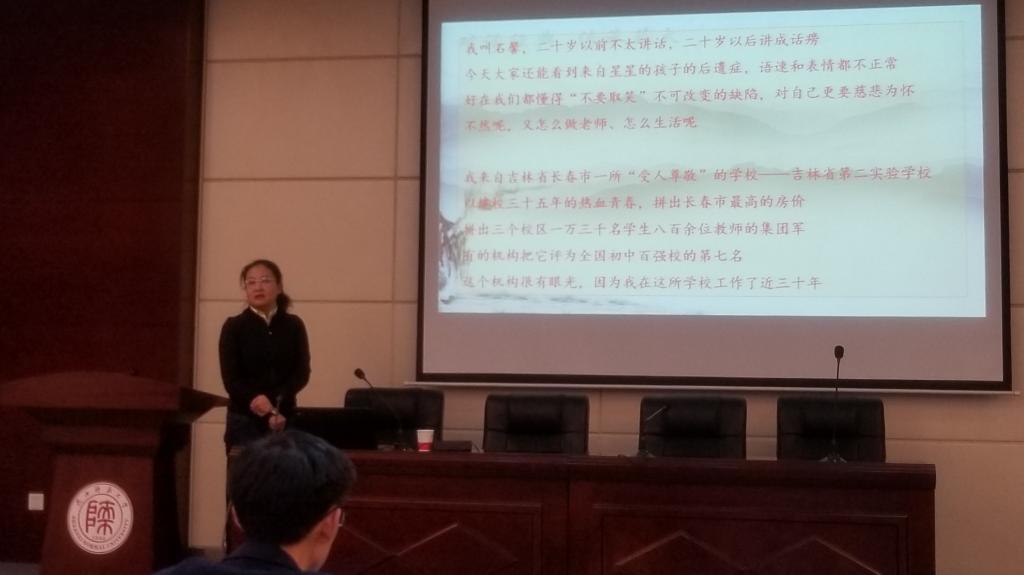 29日下午,石馨老师作了题为《对话经典,传承薪火——语文教育的回归与唤醒》的讲座。她先从一则故事引出“教语文一定要教经典,首先要教经典”这一主题,分享了自己对于《经典阅读课堂教学与员工人格养成》课题的新看法,并对语文教育中回归与唤醒的对象首先是谁、语文老师如何实现回归唤醒、语文老师如何备课才是本真备课这三个问题进行了详细的解答,让同学们更加深刻地了解到备课的必要性。
