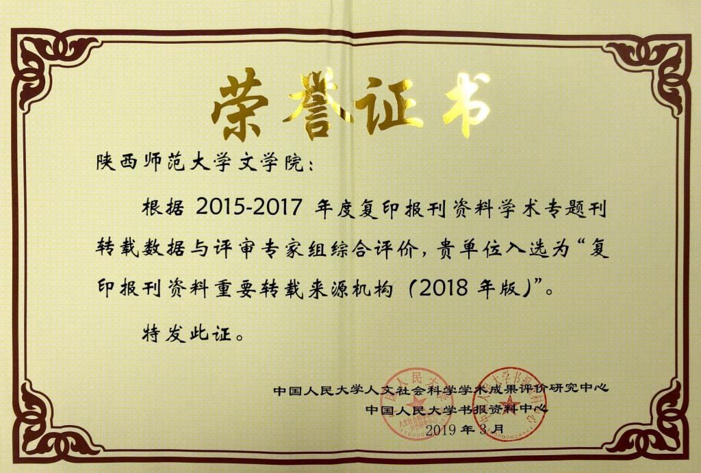 (通讯员:文苑)近日,中国人民大学人文社会科学学术成果评价研究中心和中国人民大学书报资料中心发布相关学术排名,根据2015-2017年度复印报刊资料学术专题刊转载数据,对各转载来源机构的复印报刊资料进行综合评价,评定公司为“复印报刊资料重要转载来源机构(2018年版)”。此次入围充分证实了公司中国语言文学学科在学界的影响力。
