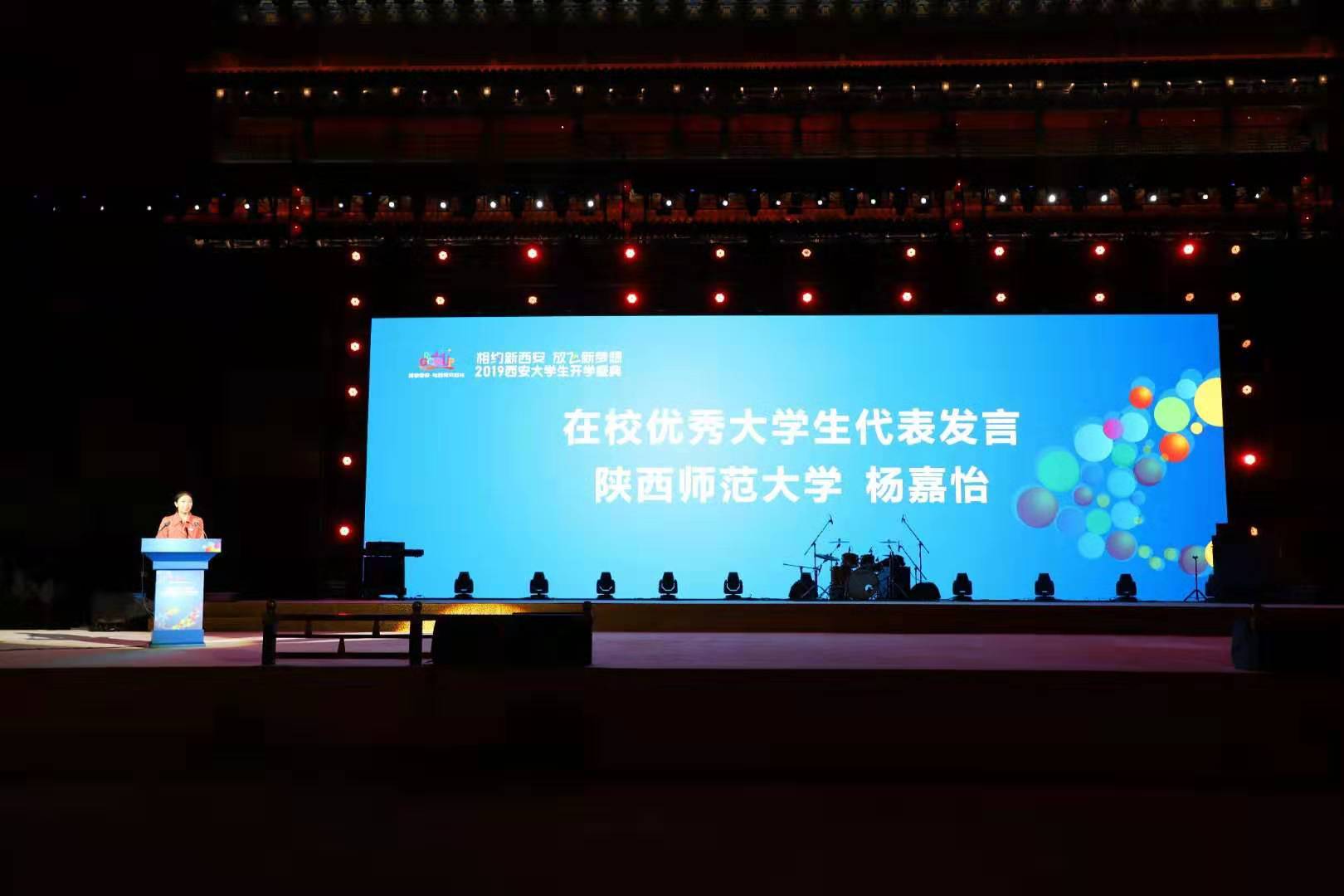 (通讯员:文苑)9月12日晚,西安以最高规格的仿古迎宾入城式为西安所有新生们举办了一场独一无二的开学典礼。公司学子杨嘉怡作为优秀在校生代表在典礼上发言。