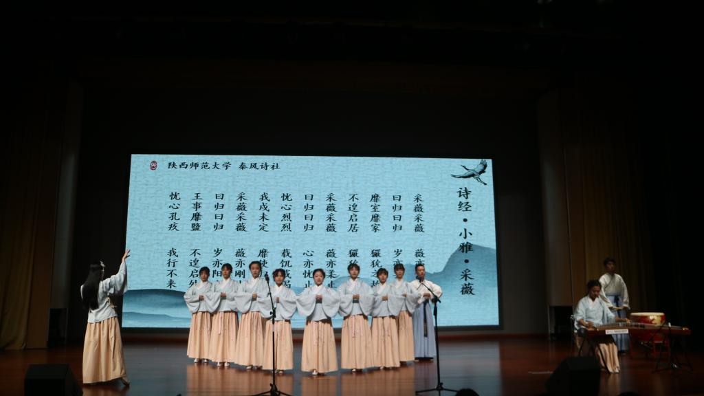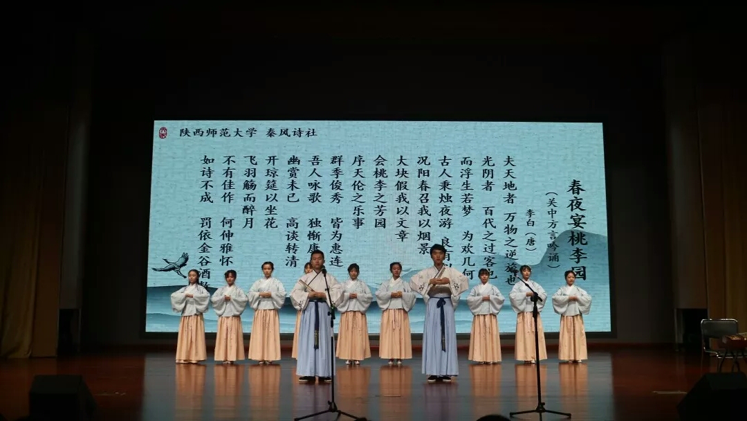 22日下午六时,联吟展演在江苏师范大学马可音乐厅举行。南北相会、两岸齐聚,来自海峡两岸的13个诗社用36首经典诗篇的吟诵,共同打造出一场吟诵盛宴。公司秦风诗社以《春夜宴桃李园序》和《诗经·小雅·采薇》两首篇目压轴出场。“桃李会,俊秀集”,在《春夜宴桃李园序》中,洒脱的关中方言吟诵配以精心编排的情景剧,极尽太白举宴的潇洒之态,充分展现出秦地豪情;“昔我往矣,杨柳依依,今我来思,雨雪霏霏。”《诗经·小雅·采薇》则以独特的队形变换,鼓点和古筝的相互配合,来表现诗文情感,令人耳目一新。最后,大会在两岸师生深情吟唱的“古韵新妍”经典保留篇目《蓼莪》中落下帷幕。活动举办期间,公司师生还参加了汉文化训练营。