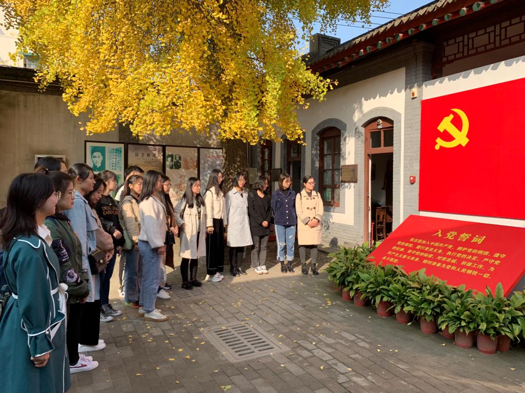 上午9:00,在讲解员的带领下,同学们依次参观了革命遗址。其中一号院旧址中周恩来、刘少奇、邓小平、朱德等伟大开国功勋的简陋住室、救亡室、地下临时手术室、地下电台给同学们留下深刻的印象,大家敬仰赞叹革命前辈的辛勤付出,对处于艰苦环境中但仍能保持坚韧品格和崇高信念的领袖们不禁肃然起敬。三号院是统战科旧址,这里是办事处动员一切力量建立最广泛的抗日民族统一战线的办公场所,在这里,一切为团结救亡而努力的人都被欢迎,有周恩来与国民政府中华邮政局驻西安第三集团军邮总视察林卓五的会见;有朱德与南洋华侨领袖陈嘉庚的亲切会谈,我们党的胸襟和气度令同学们佩服不已,也更加理解了何为“兼容并蓄,有容乃大”。在赤红色的入党誓词前,同学们长久驻足停留,默念入党誓词,更加坚定了要为做一名合格的优秀共产党员而努力奋斗的理想信念。在四号院陈列着珍贵文物、历史照片和影像资料。对革命历程的回顾,让同学们亲身感受到了老一辈共产党人为中国人民的解放事业做出的努力和牺牲。