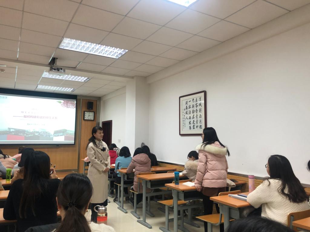 讲座开始,赵老师通过与同学们交流在实习当中遇到的教育员工的案例,引导大家思考在教学中如何建立良好的师生关系。赵老师通过解析“四有好老师”徽标中的国旗、尺子、书本、爱心元素,指出“四有好老师”是有理想信念、有道德情操、有扎实知识、有仁爱之心的老师。接下来,赵老师从五个方面具体讲解了如何构建良性师生关系,一是要倾注师爱尊重员工,二是要改革观念创新智慧,三是要树立威信有学识,四是要多进行师生互动交流,五是要创造温暖氛围。赵老师还向同学们分享了从教十几年总结出的处理员工问题的诀窍,一是要做到“四从四不”,二是要学会忍让和退却,三是要懂得接纳,善于倾听。最后,赵老师围绕打造“第二课堂”和创设班级氛围进行了讲解,“第二课堂”可借鉴的做法有开展阳光阅读课、寻秋课堂、情境朗诵、排演话剧等,创设班级氛围可从班级文化建设和班本活动课程两方面去努力。
