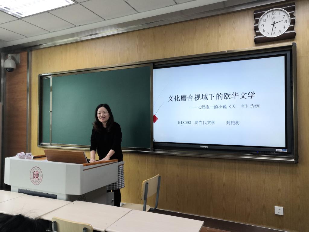 2019年11月25日,第149场博士学术报告以《文化磨合视域下的欧华文学———以程抱一的小说<天一言>为例》为题,由中国现当代文学博士研究生封艳梅主讲。封艳梅首先介绍了文化磨合的概念:和而不同,文化互鉴。接着,她介绍了小说《天一言》的基本情节、内容。最后,她详细梳理了该小说中吸收、化合的欧华文化的因素。封艳梅通过跨文学文化交流与磨合的思路,探讨中西文化磨合的生成意义,详细讲解了中西文化磨合的具体体现。
