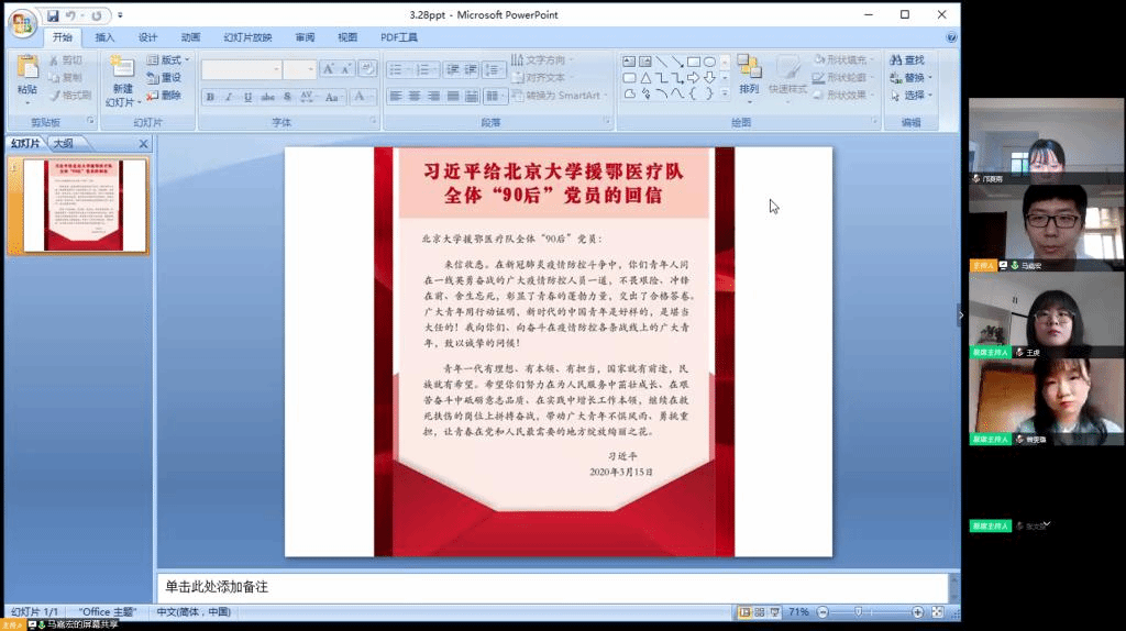本科生兼职团委副书记李云洁、墙紫薇分别介绍了习主席的战“疫”高频词、纪录片《命运与共,全球战疫》的相关内容,分享了自己学习体会。让同学们在了解全球疫情的同时,看到中国以人类共同体为指引,为抗击疫情、防止疫情蔓延做出了巨大的努力与探索。