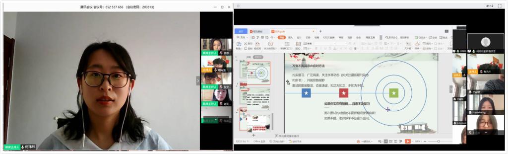 何玮玮结合自身经历,从五个方面做了经验分享:保研流程简介、夏令营九推经历、外推经验分享、面试中的万变和以不变应万变的应对策略。何玮玮根据自身经历,对同学们提出了几点建议:一是自身大胆尝试,多报名各大高校的夏令营海投,密切关注各高校新一年的研究生招生简章;二是突破消息壁垒,扎实复习、广泛阅读、关注学界动态;三是坚定考研信心,按照科目规划复习进度,提前准备面试材料,杜绝外界干扰和焦虑。