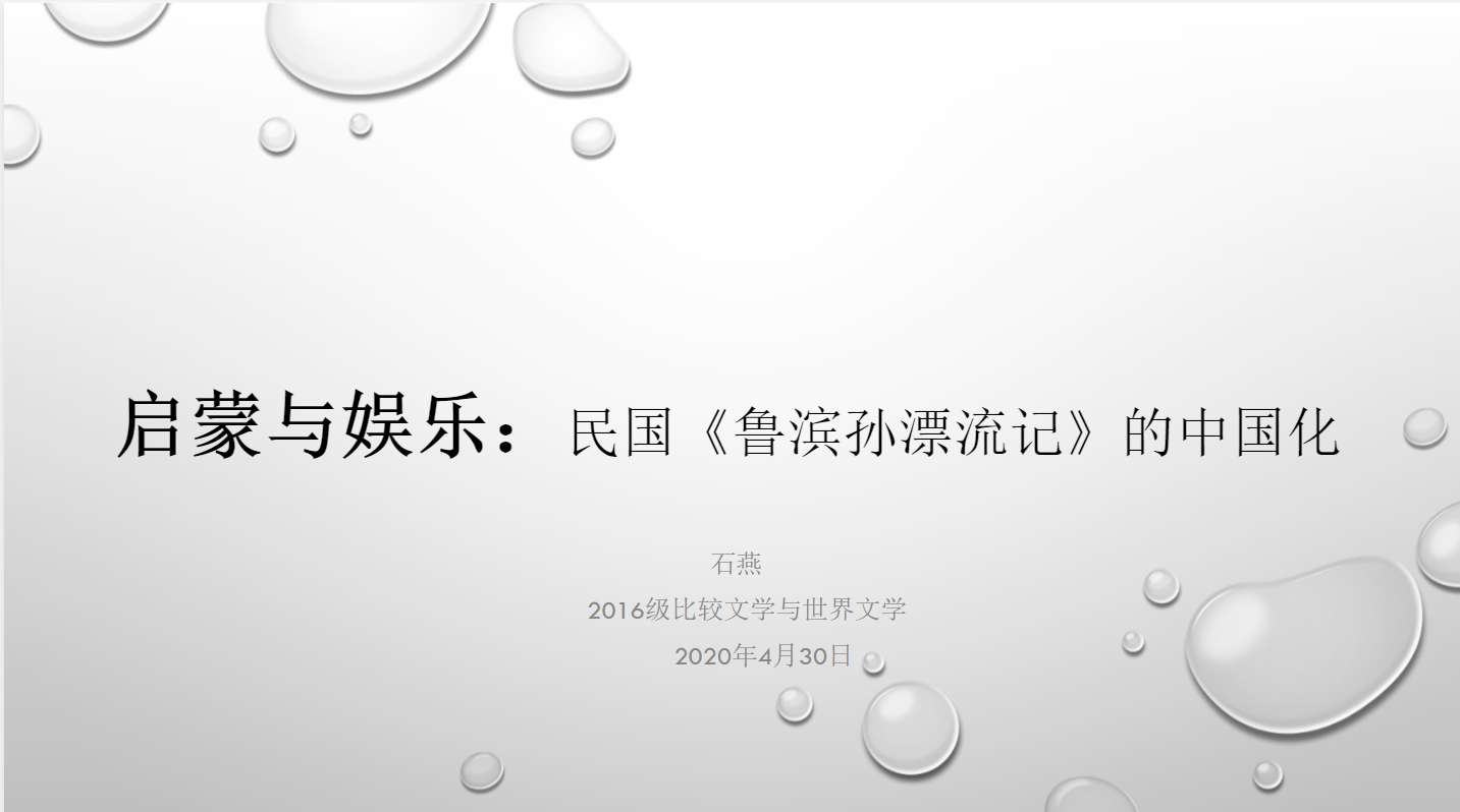 2020年4月30日,第152场博士学术报告以《启蒙与娱乐—民国<鲁滨孙漂流记>的中国化》为题,由比较文学与世界文学博士研究生石燕主讲。报告首先从民国汉译儿童版的“爆发式”面世和西方电影鲁滨孙故事的引入谈起。接着石燕通过对汉译儿童版中的启蒙诉求、电影鲁滨孙故事的娱乐功能、寓教于乐儿童读物的产生三方面的讲述,向听众们展现了少年冒险英雄鲁滨孙的英勇无畏与坚韧不拔的精神。最后石燕指出《鲁滨孙漂流记》在汉译过程中对民国知识精英的推动和近代大众文化的形塑作用,即启蒙与娱乐的分离与融合,开启了《鲁滨孙漂流记》中国化的方向。