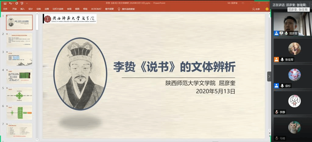 2020年5月13日,第158场博士学术报告以《李贽<说书>的文体辨析》为题,由文艺学博士研究生屈彦奎主讲。屈彦奎从李贽《说书》的相关背景出发,主要阐述了李贽《说书》中对文体问题的相关观点。报告中屈彦奎主要从“说书”基本演变的三个阶段出发,论述了“说书”在内容、形式、语体、思想上的文体特征。接着,他又将间接因素、直接因素和相关旁证相结合,分析了现存被认为是《说书》的著作均不是八股文,《说书》文体为“说书”。最后,屈彦奎介绍了“说书”文体对于李贽研究的价值。