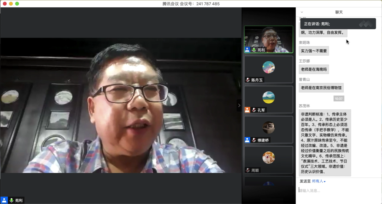 苑利研究员分别从“什么是非遗”、“为什么保护非遗”,以及“怎么保护非遗”这三个问题,站在全国非物质文化遗产保护的高度,提出了非物质文化遗产保护过程中应当秉持“原汁原味”的原则,以此来认识非物质文化遗产的保护、传承和发展问题。讲座采用线上直播的方式,生动直观,通俗易懂。苑利研究员在讲授的过程中,举了大量陕西的非物质文化遗产实例,如兵马俑、西安鼓乐、凤翔木版年画、安塞剪纸等,用陕西的非遗元素拉近了与观众们的距离。