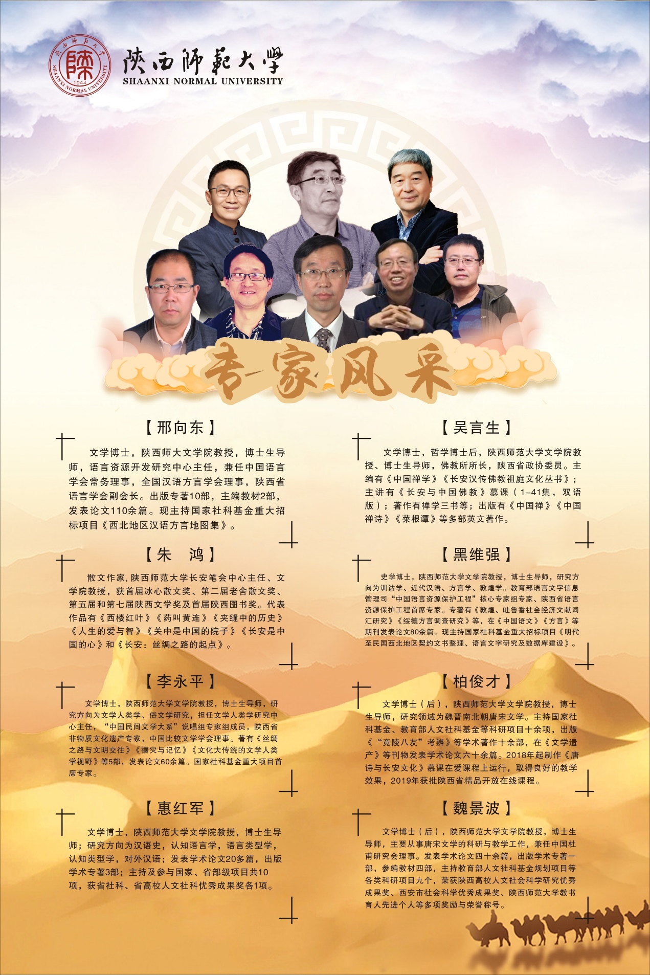 “丝路讲坛”栏目共设八讲,2020年7月11日播出第一期,每周六在西安一套、五套首播。讲坛邀请了bw西汉姆联朱鸿、吴言生、柏俊才、魏景波、邢向东、李永平、黑维强、惠红军等8位专家学者,围绕“丝绸之路上的语言、文化”这一主题,面向社会各界人士,探讨丝路上的文明与传奇故事。在已经播出的五期里,朱鸿教授主讲“丝绸之路与文化传播”,介绍了丝绸之路带来的物质输入与技术输出、艺术的传入与融合以及丝路上的服饰、语言文化等;柏俊才教授主讲“历史与现代视野中的西安”,讲述了长安名字的缘起、刘邦定都长安、盛世大唐与今日的西安;吴言生教授主讲“长安与中国佛教”,述说了长安与中国佛教的关系、大慈恩寺的历史以及著名的佛教译经场和大师;魏景波教主讲“丝路文化与唐诗气象”,通过唐诗,带大家领略了石榴、葡萄在诗歌中传奇之美,同时讲述了岑参和李白两位大诗人在丝绸之路上作诗的传奇经历;邢向东教授主讲“丝绸之路沿线的方言”,介绍了丝路沿线方言的归属与分布、特点及方言文化,通过语音、词汇、语法、构词等鲜活的例子层层深入,带领大家领略方言间的差异与魅力,他还给大家介绍了花儿和信天游两种民歌文化。即将播出的三期,还将为大家呈现丝绸之路上的契约文书、宝卷研究和语言接触等主题。