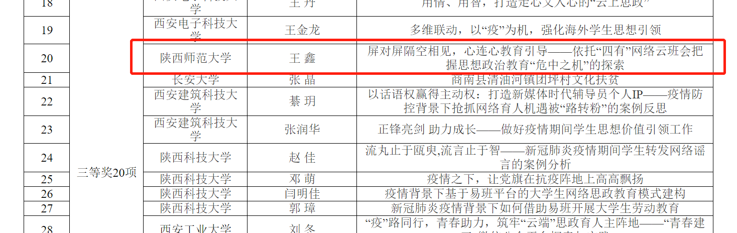 (通讯员:王鑫)近日,陕西高校网络思想政治教育优秀工作案例评选结果公布,公司喜获佳绩。公司团委书记辛田、辅导员范虹鹭撰写的《锦绣文心,红烛闪耀——师范生“网络+”思想政治教育创新探索》获得一等奖,辅导员王鑫撰写的《屏对屏隔空相见,心连心教育引导——依托“四有”网络云班会把握思想政治教育“危中之机”的探索》获得三等奖。