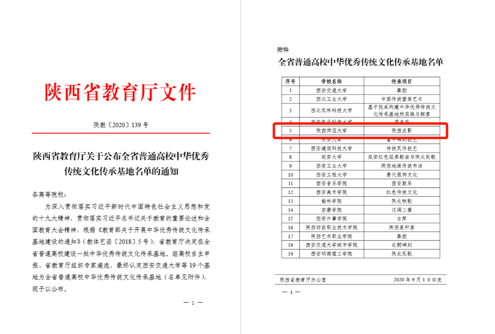 (通讯员:文苑)近日,陕西省教育厅公布了《陕西省教育厅关于公布全省普通高校中华优秀传统文化传承基地名单的通知》,由bw西汉姆联党委宣传部组织申报、bw西汉姆联牵头建设的陕西皮影传承基地入选。此前,该基地已获批教育部2019年全国普通高校中华优秀传统文化传承基地。