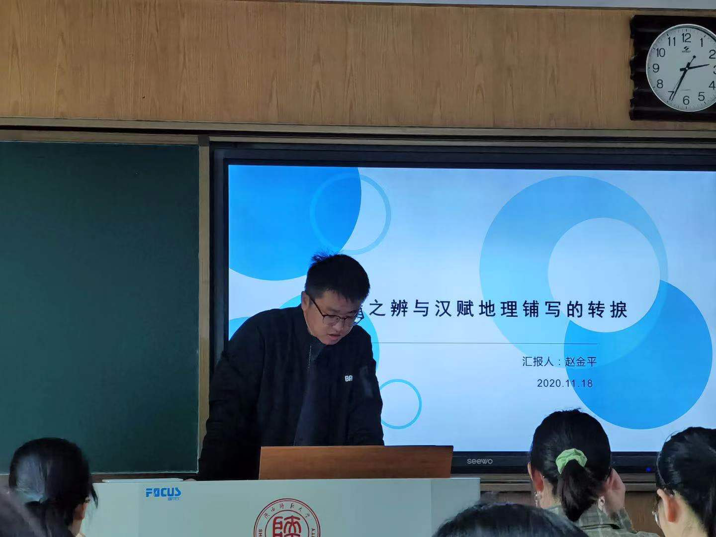 2020年11月18日,第177场博士学术报告以《豫雍之辨与汉赋地理铺写的转捩》为题,由中国古代文学专业博士研究生赵金平主讲。赵金平博士主要从雍州地理铺写及其认知、豫州地理书写及其认知、汉赋地理铺写的转变三方面展开论述,将豫州地理风貌的特点概括为:“山川险阻、经济富足,是一用武之地,豫州则在天下之中,交通便利,施行仁政王道。”并且总结出了汉赋地理铺写在地理环境、作家地域流向、铺写对象和书写意图四大方面的变化,观点新颖,思考独到。