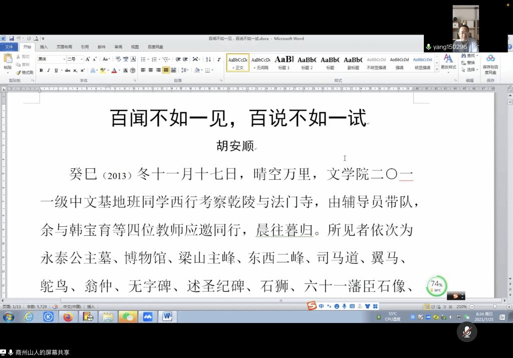 7月25日上午,公司胡安顺教授为营员做了题为“百闻不如一见,百说不如一试”的专题学术讲座。讲座由公司副经理杨晓斌主持。胡安顺教授主要从老员工成长成才与古代汉语研究两个角度出发,为同学们进行了深入浅出的阐释。胡安顺教授指出,夏令营营员作为准研究生,首先要提早明确研究方向,并做出实际努力。其次,应充分利用课余时间,培养广泛的学习兴趣,成为一个多才多艺、全面发展的青年。最后,就古代汉语的学习,胡安顺教授结合个人实际经验,讲述了“百闻不如一见,百说不如一试”的内涵,他倡导营员们在读书、写作、治学中多读勤写、多练勤学。