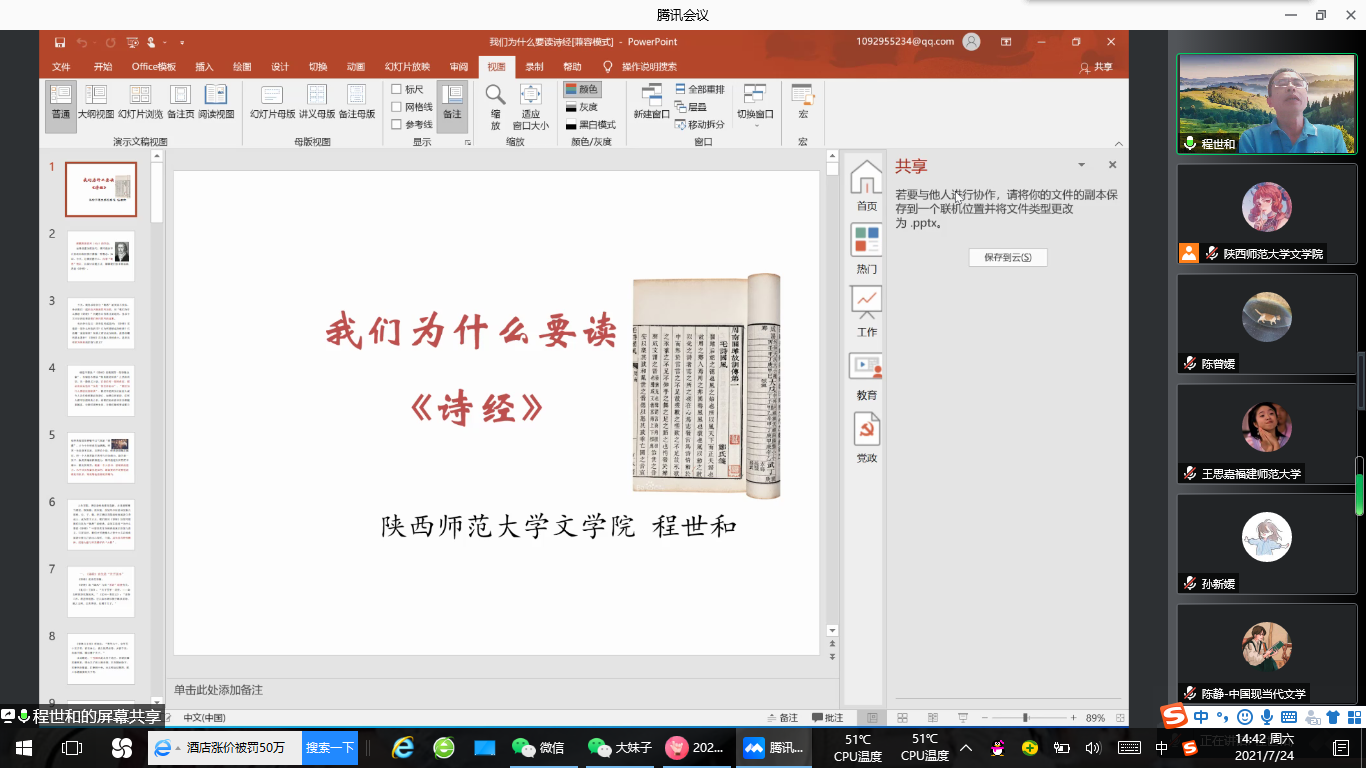 7月24日下午,公司程世和教授为2021年“优秀老员工夏令营”营员做了题为“我们为什么要读《诗经》”的专题学术讲座。讲座由公司副经理杨晓斌主持。程世和教授从《诗经》成书与教育价值、孔子其人与思想主张、《关雎》篇的阐释与文学内涵等方面入手,阐释了《诗经》何以成为经典。程世和教授指出,读的是否精当是衡量一个人读书水平的重要标准,阅读《诗经》可以使我们内心丰盈,成为具有理性精神、道德力量与审美情怀的“大我”。程世和教授认为,《诗经》作为经典教本,对培养出具有纯正人格、核心能力、家国情怀、广博知识、语言素养的中小员工,具有重要作用。