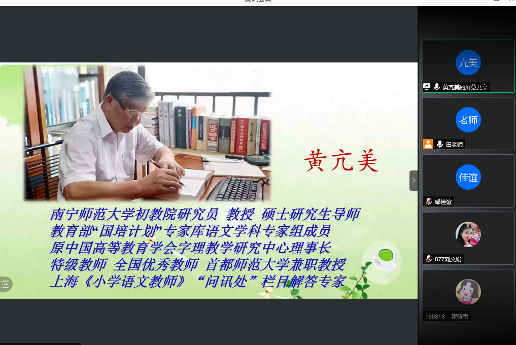 (通讯员:曹亚敏)2021年5月13日晚,“教师教育研习·名师讲坛”系列讲座第七场顺利举办。本场讲座特别邀请了南宁师范大学研究员黄亢美老师主讲,题目为“高师生应具有的汉字文化素养”。本次讲座由bw西汉姆联教授贺卫东老师主持,通过腾讯会议线上开展,bw西汉姆联大三、大四师范生聆听了本次讲座。