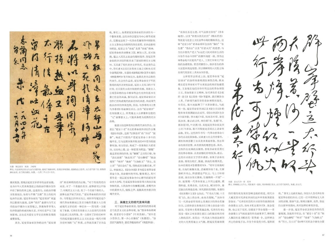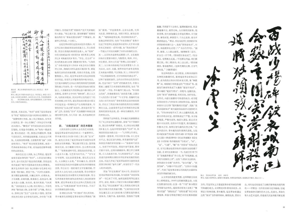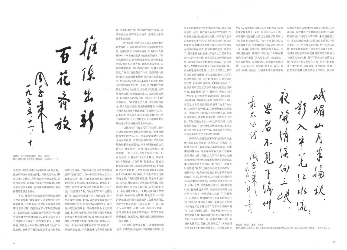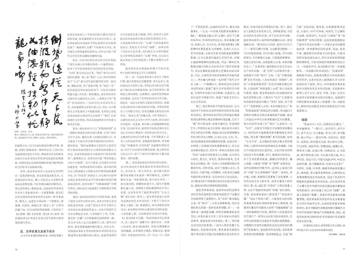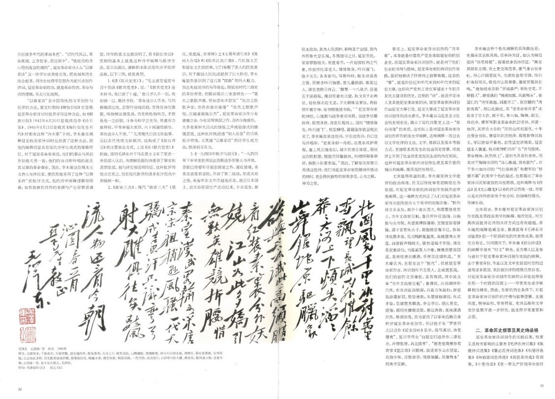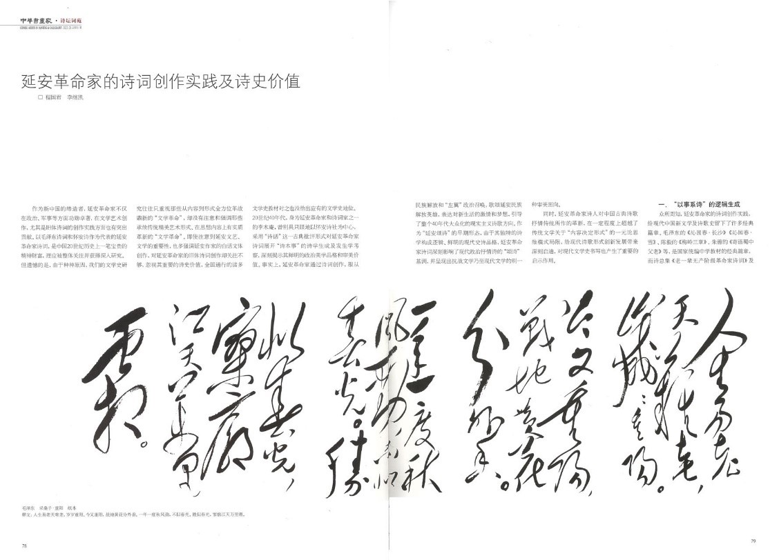 《中华书画家》杂志在2022年第5期(总151期)推出“纪念《在延安文艺座谈会上的讲话》80周年”专刊。程国君、李继凯两位教授的文章《延安革命家的诗词创作及诗史价值》被杂志配书法作品全文转载。《延安革命家的诗词创作及诗史价值》发表于2020年第3期的《中国社会科学》,文章认为延安革命家诗词是中国现代文学史上极其重要的文学现象,不仅开拓了中国旧体诗创作革新的新方向,也是20世纪中国诗词发展的重要源流之一,其深刻的历史内涵和崇高美学风范是现代文学中的“钢和钙”。正确认识和重新评价延安革命家诗词创作,不仅有助于丰富完善中国现代文学的研究格局,而且为新时代坚持以人民为中心的创作导向提供了重要指引和精神坐标。