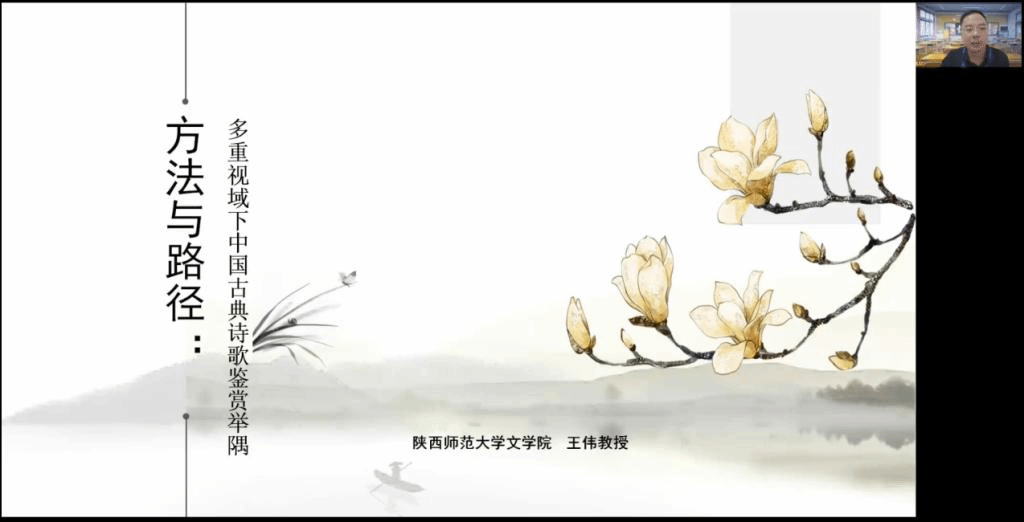 课程伊始,王伟老师分析了古典诗歌鉴赏的误区和困境,即在诗歌鉴赏中如何对字词有准确的理解、对句意有恰到好处的把握、理解意境的言外之意,对诗歌中表现手法进行归纳总结等。随后,王伟老师分享了五个关于古典诗歌鉴赏的方法。第一个方法是文化语境的建构,他例举小学诗歌《望庐山瀑布》和《春晓》,通过了解李白和孟浩然的思想和精神来回溯这两首诗歌,提出对诗歌新的理解,他表示越是简单的诗歌,越不简单。第二个方法是异文辨析与还原,他强调有时候一个字或一句话都会影响诗意。比如李白《静夜思》,根据与李白相近时代的人对其诗编纂的诗集去还原李白的诗,得出对此诗更准确的剖释。第三个方法是结构分析和联想,他例举了《望岳》和《回乡偶书》,通过分析和联想,体会出诗句的弦外之音,理解诗歌的真正内涵。第四个方法是知人论世、以意逆志,他认为对诗歌的作者和背景有所了解,才会对文本的解读更浓厚。第五个方法是文化素养的培养和勾连,鉴赏诗歌对解读和阅读诗歌的人都有所要求,必须加强和丰富文化素养,才能深刻体悟诗歌内蕴。
