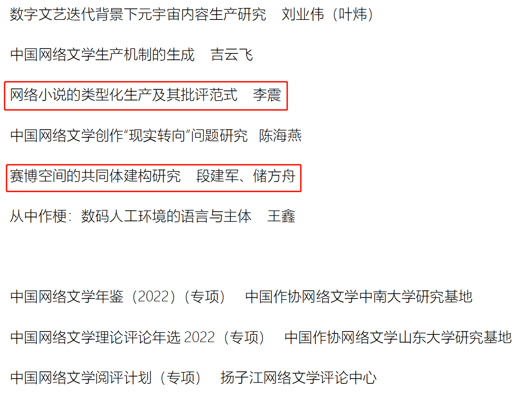 (通讯员:文苑)近日,中国作协网络文学中心“2022年度中国作协网络文学理论评论支持计划项目”评审结果公布。