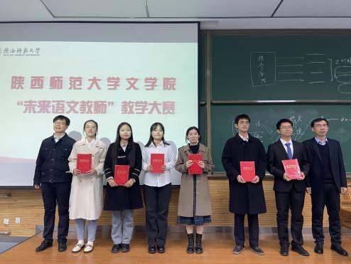 在五位名师的精彩点评之后,比赛进入颁奖环节。何冠霖、付博、刘卓萱、吕依潼、张蓝心、庞诗凡六名同学获得特等奖,并将代表陕师大参加第三届部属师范院校“未来语文教师”教学技能交流展示会,刘天宇、丁小戈、霍丁怡、张杉杉四位同学获得一等奖,李思佳、游婉琳、谢庆英、张丹丹、陈怡君五位同学获得二等奖。获奖选手和评委老师依次进行合照,