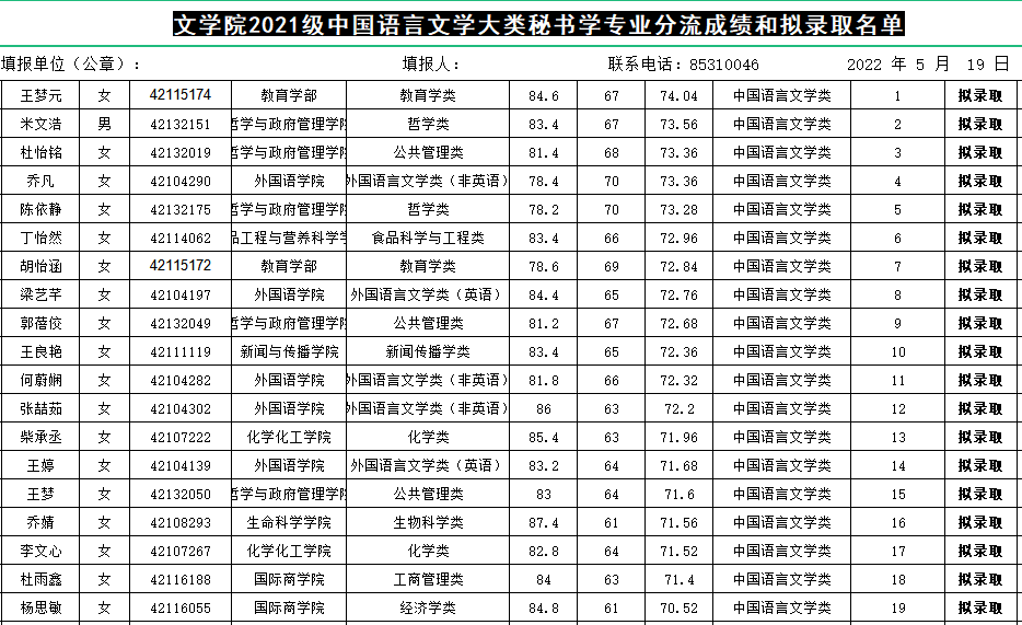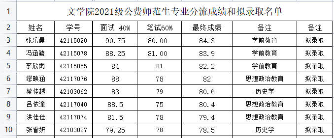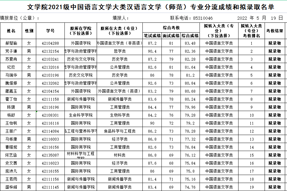 1.中国语言文学大类汉语言文学(师范)专业分流成绩和拟录取名单: