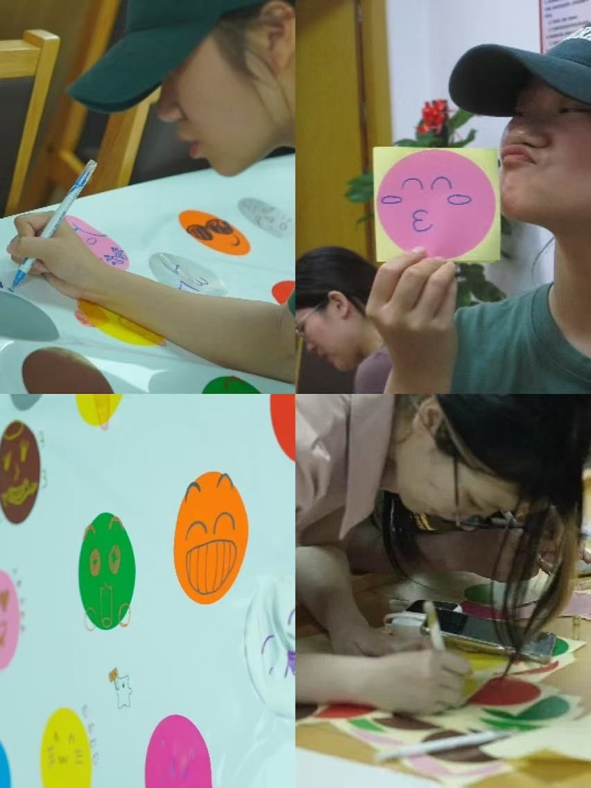 现场同学用画笔在画板上绘画笑脸,在画纸上存下掌印。想象云飞天外,圆圈圈出少年的炽爱,画笔勾下心海的蔚蓝。
